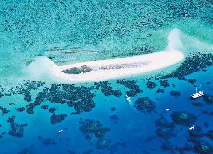 Båten din er en vel 100 fot stor luksuskatamaran, og dagens mål er en sandbanke på det ytre revet, Michaelmas Cay.