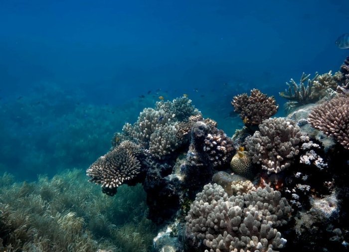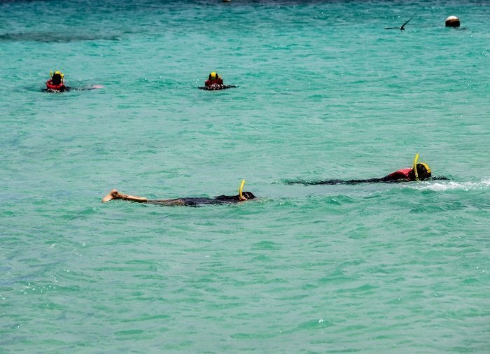 Du kan snorkle rett fra båten, eller du kan komme deg over til sandbanken og snorkle herfra. Hele dagen går det en liten båt i fast rute mellom katamaran og sandbanke, så du kan enkelt komme deg frem og tilbake.