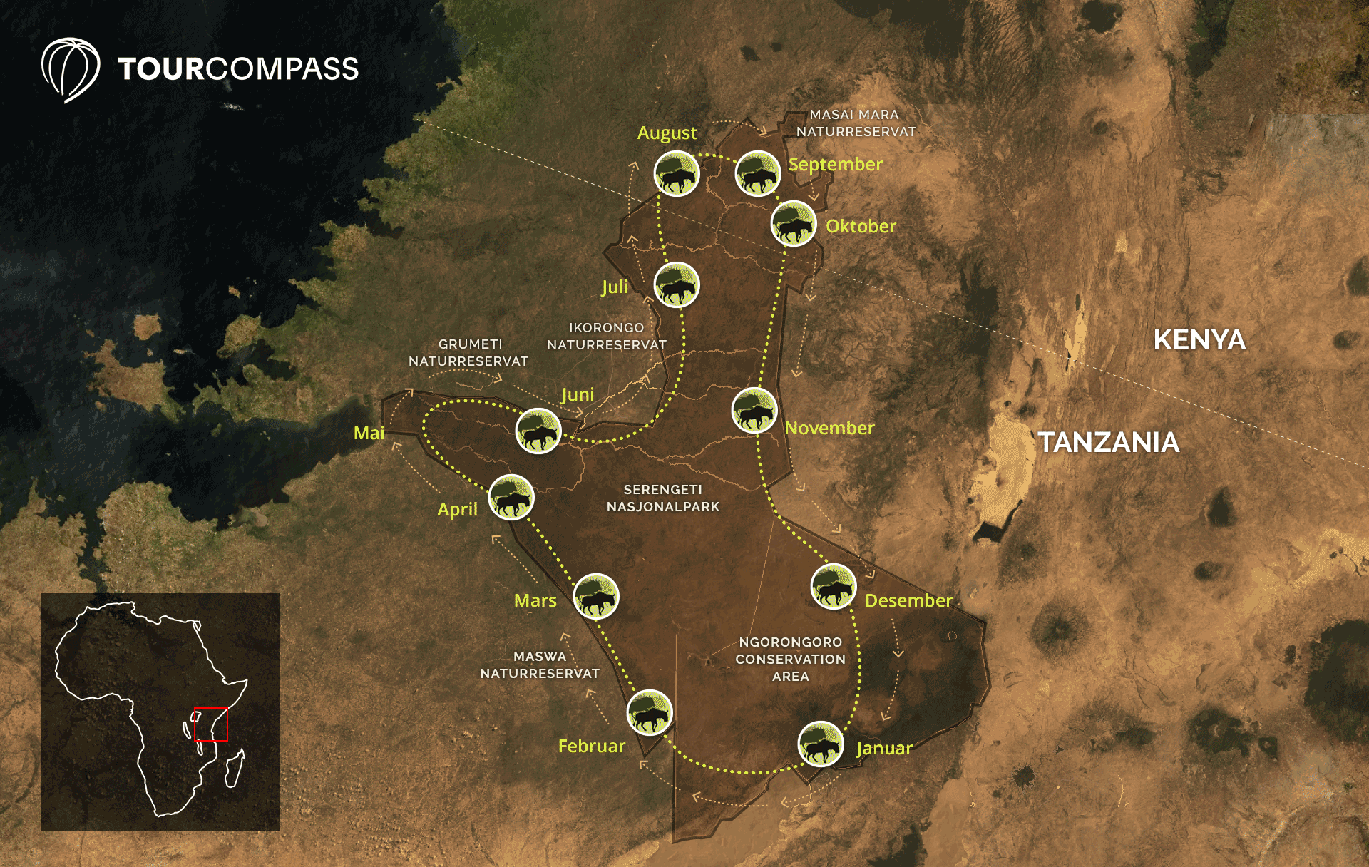 Den store vandringen er en kontinuerlig prosess som skjer igjen og igjen, år etter år. Den er altså ikke bare en årlig begivenhet, men noe du kan oppleve året rundt på forskjellige steder på dyrenes rute.