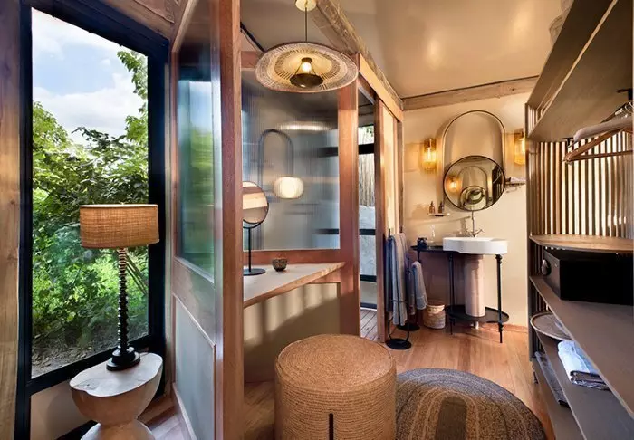 De 16 teltene har alle eget bad med frittstående badekar, aircondition, te- og kaffefasiliteter og egen balkong. Alle teltene er bygget på plattformer som står på pæler, noe som gjør at luften kan sirkulere under teltene. Alle teltene er likt innredet – forskjellen består av om man ønsker å ha utsikt til elven eller utsikt til hagen.