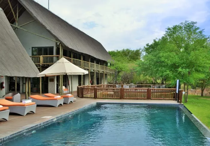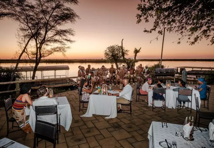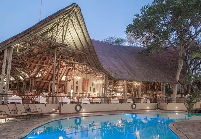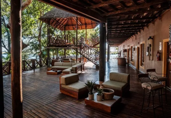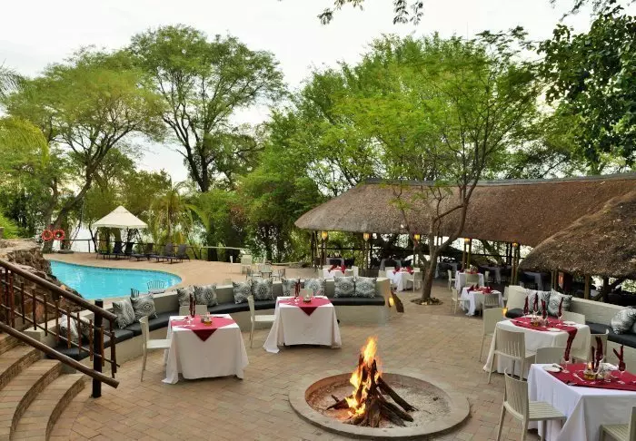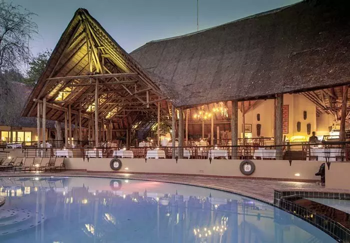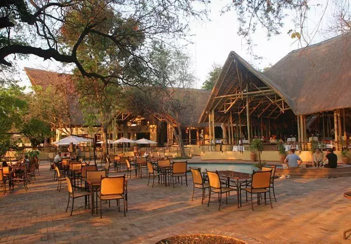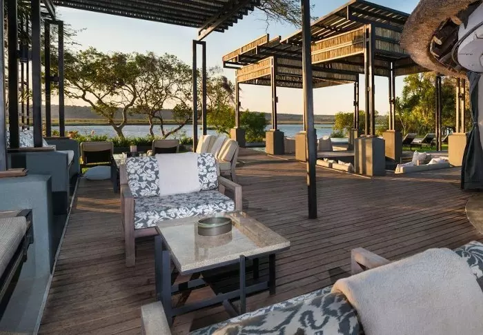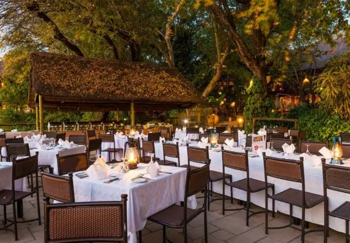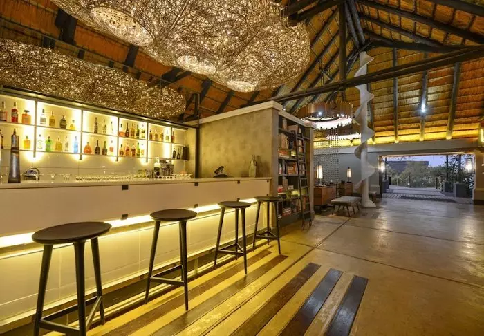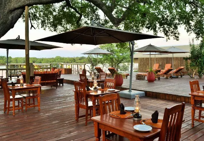 Lodgen har to restauranter, spa og to barer, og den ene av dem er det perfekte stedet å nyte en” sundowner” med utsikt til elven og solen som går ned over nasjonalparken.