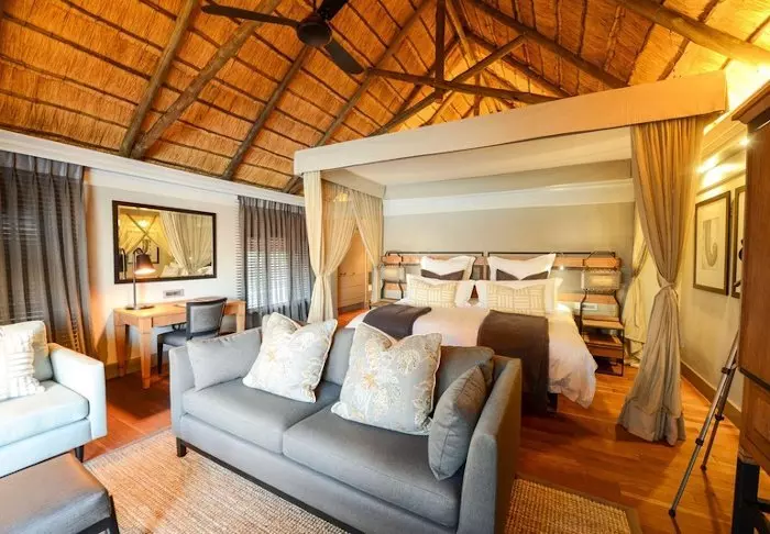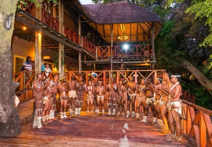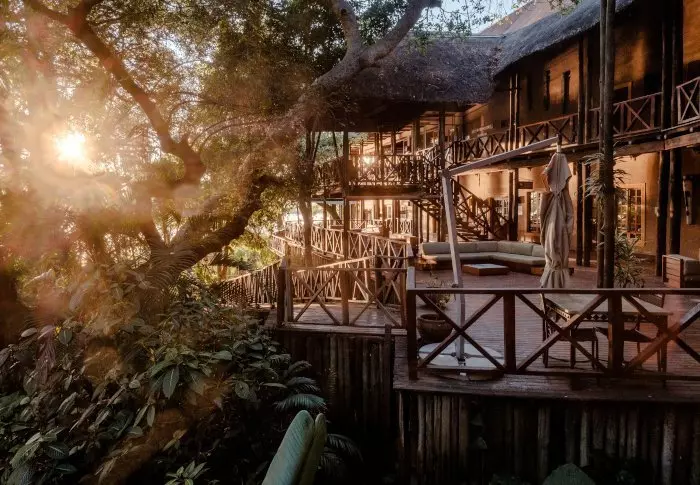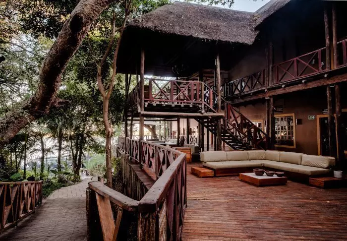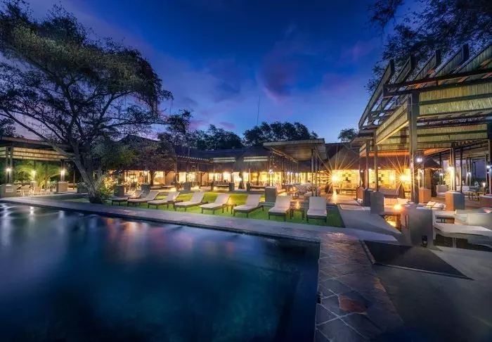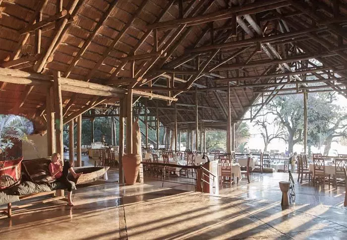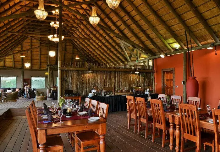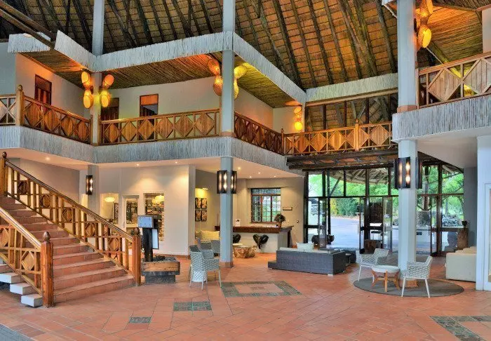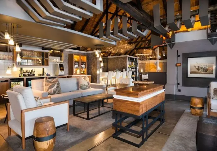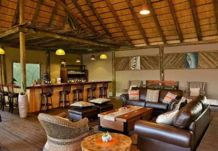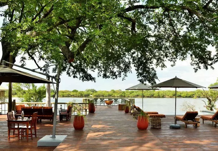 Lodgen har to restauranter, spa og to barer, og den ene av dem er det perfekte stedet å nyte en” sundowner” med utsikt til elven og solen som går ned over nasjonalparken.