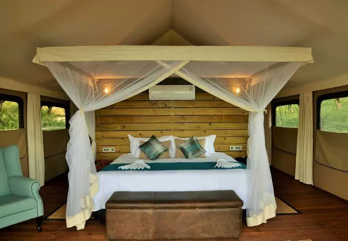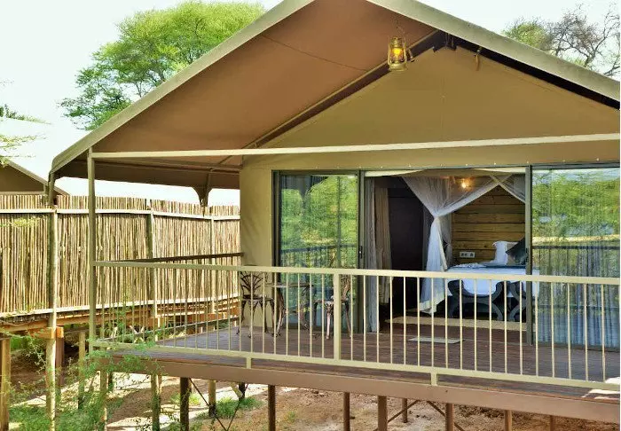Det er ingen permanente bygninger i leiren, noe som er med på å gi deg følelsen av virkelig å være midt i naturen. Inne i teltet får du følelsen av luksus. Midt inne i teltet står en myk seng, og du har ditt eget bad med rennende vann og innendørs og utendørs dusj. Alle teltene er reist på plattformer, og fra de koselige verandaene er det flott utsikt over området.