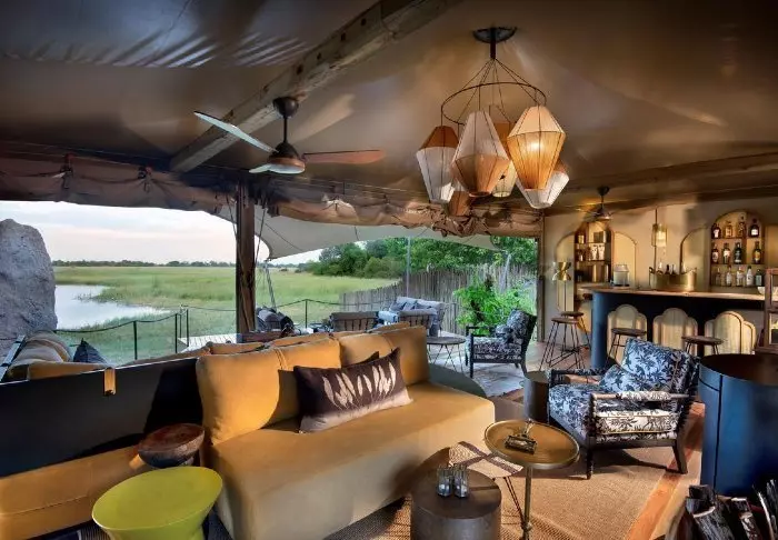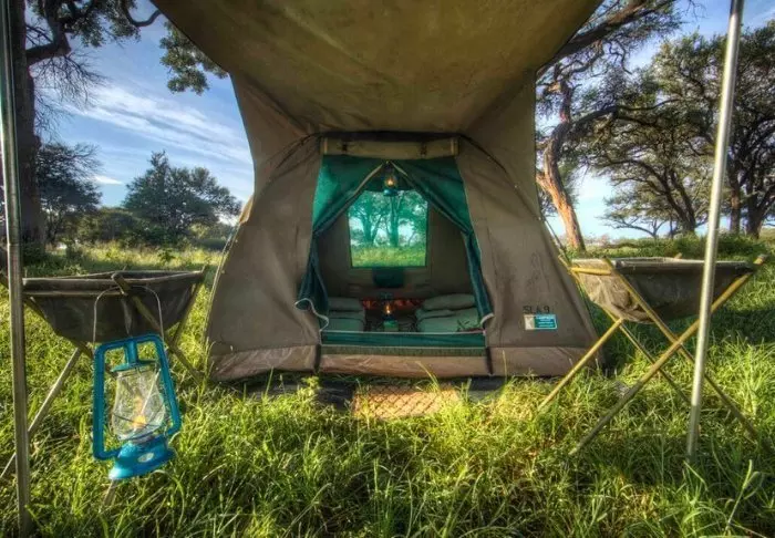 Utenfor teltet er det en liten skyggefull baldakin med stoler, slik at du kan nyte utsikten over naturen rundt deg. Du sover på en komfortabel sammenleggbar seng med en deilig og myk madrass, ekte dyner og puter og et lite nattbord. I direkte forlengelse av teltet har du ditt eget bushbaderom med dusj og toalett. Teltet har ikke strøm eller rennende vann, og du trekker ned i toalettet ved hjelp av jord og en liten spade – men det er et toalett! Flere ganger om dagen får du varmt vann, og du kan vaske deg i en liten servant som står i et stativ utenfor teltet. Hvis du har sett filmen «Mitt Afrika», vet du nøyaktig hvordan det fungerer. Om ettermiddagen blir vannet varmet opp og heist opp i en bøtte med et dusjhode under, slik at du kan ta en god og varm dusj. Det er primitivt, men komfortabelt, og viktigst av alt – det er overnatting på naturens egne vilkår, hvor du ikke etterlater spor mens du kommer nær deltaets dyreliv.