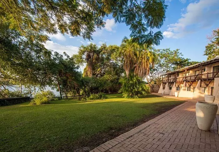 På den andre siden av resepsjonen ligger den store gressplenen ned mot Chobe-elven, der flodhestene brøler i vei både dag og natt.