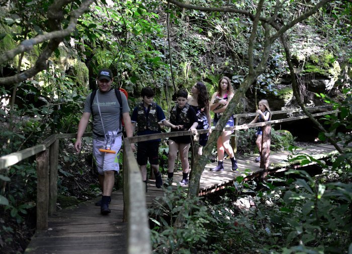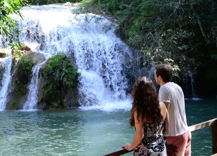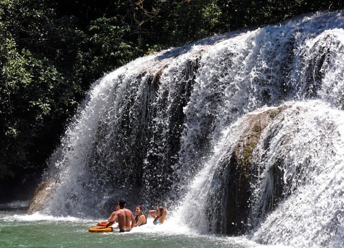 Deretter legger du ut på en guidet vandring gjennom den frodige skogen rundt elven Rio Mimoso, der du passerer 9 fosser med forskjellige former og størrelser. Underveis kan du svømme under fossene og i naturlige bassenger, utforske små huler og se ut over Serra da Bodoquena med fossene og fjellene i dalen rundt Mimoso-elven. Hvis du føler deg modig, kan du hoppe fra en 6 meter høy bro og ned i et naturlig vannhull. På noen strekninger kan du også bli med på en liten båttur og slappe av mens du nyter omgivelsene.