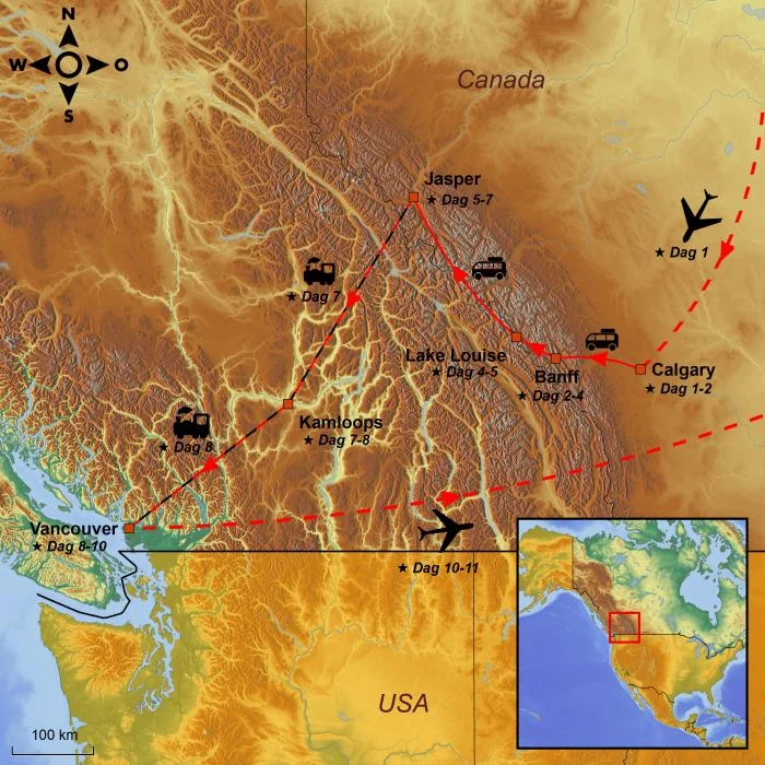 Reisen starter i westernbyen Calgary, hvor du tilbringer den første natten og kan lande etter den lange reisen. Etter en formiddag i Calgary blir du hentet av din guide, og derfra starter eventyret inn i de canadiske Rocky Mountains – også kalt de canadiske Rockies.