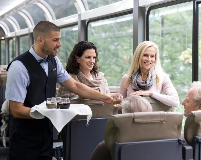 Mens du nyter togets herlige frokost og lunsj, åpner Rocky Mountains’ dramatiske landskap seg opp rett utenfor togets store panoramavinduer – de såkalte glassdomene. Kaffen har aldri smakt bedre enn akkurat her!