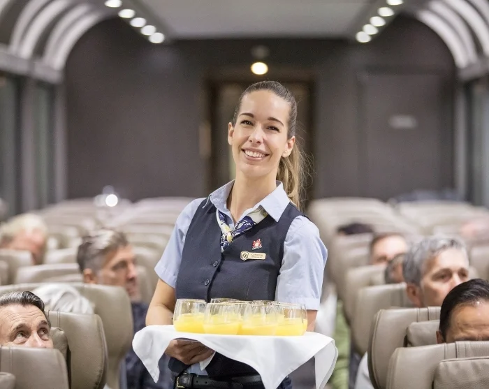 Du blir ønsket velkommen om bord av personalet, som står klare med åpne armer og rød løper, og viser deg til plassen din. Så snart turen er i gang, er det tid for frokost. Du reiser som standard på Silver Leaf, hvor maten serveres ved setet ditt. Oppgraderer du til Gold Leaf, kan du nyte måltidene i togets restaurantvogn. Uansett hva du velger, kan du se frem til en meny med ferskt tilberedte retter laget av lokale råvarer – matopplevelsene om bord er virkelig noe å glede seg til.