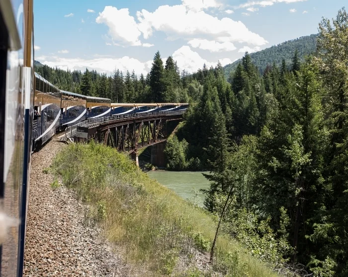 Deretter starter en togreise med luksustoget Rocky Mountaineer. På dagtid tar toget deg gjennom det fantastiske canadiske landskapet – fra Rocky Mountains dramatiske fjell og fossefall, via brusende elver og frodige daler, til storbyen Vancouver ved Stillehavet. Du overnatter underveis i westernbyen Kamloops for å få maksimalt utbytte av de utrolige omgivelsene.