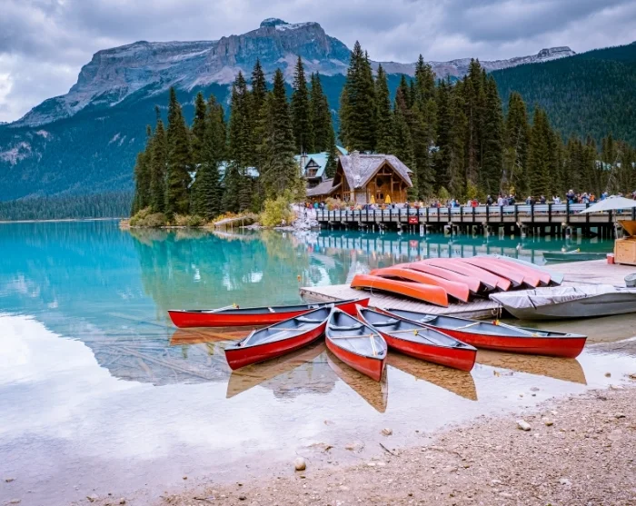Her venter et møte med den ikoniske innsjøen, Emerald Lake, som rommer naturens storhet med sitt smaragdgrønne vann, snødekte fjelltopper, skogkledde bredder og den sjarmerende hytta, Emerald Lake Lodge. Vakrere blir det knapt!