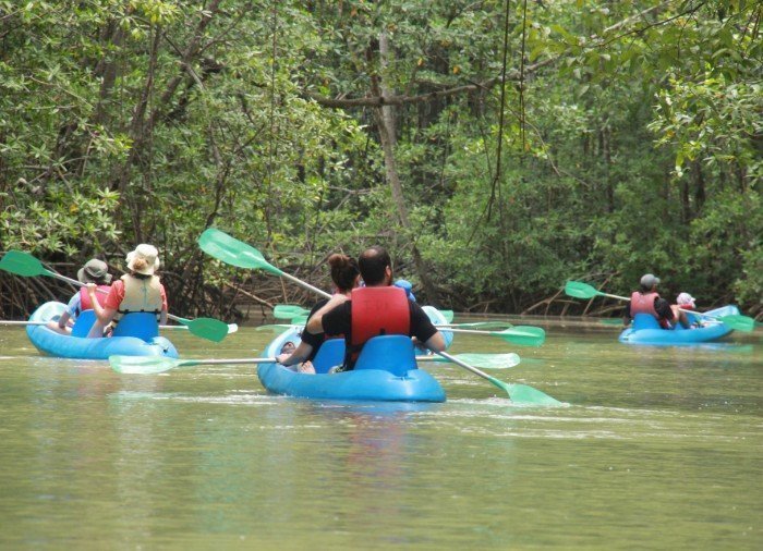 Så fører guiden deg på vannveiene gjennom den tropiske mangroveskogen, og den er full av liv. Mens du padler i skyggen av bladene fra de høye grønne trærne får du se alle de flotte mangrovetrærne med deres imponerende røtter og de eksotiske dyrene og plantene som lever blant trærne.