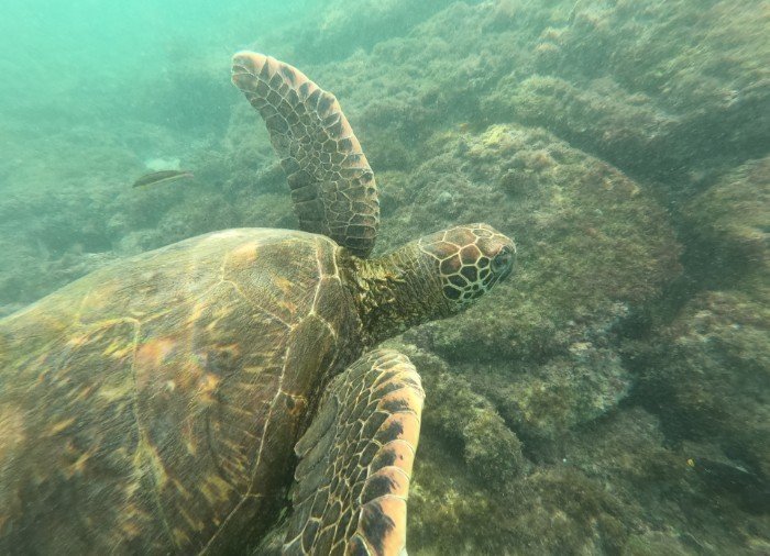 Deretter får du utlevert snorkel og maske og hopper i havet. Under havoverflaten skjuler det seg et ekte skattkammer av fargerike tropiske fisker, rokker, sjøløver og havskilpadder.