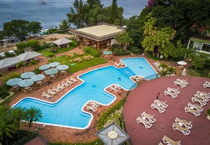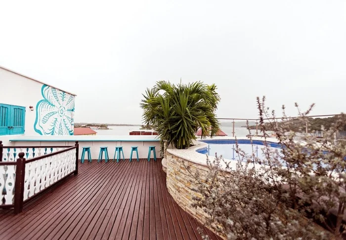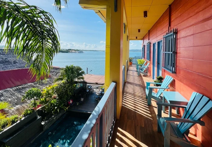 På en av hotellets takterrasser kan du ta deg en forfriskende dukkert i det lille bassenget og slappe av etter dagens opplevelser. Den andre takterrassen er et samlingspunkt for matelskere med flere barer – blant annet restauranten Achiote og baren El Remolino, som senere har blitt utvidet med Mango’s og Joboo. Her kan du nyte både lokale og internasjonale retter, utsikten over Lago Petén Itzá og noen av øyas mest spektakulære solnedganger.