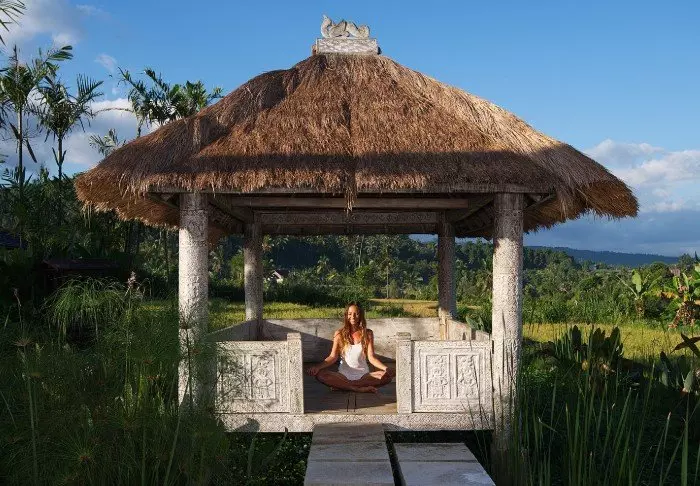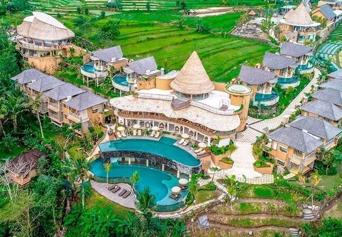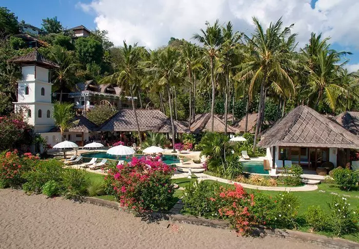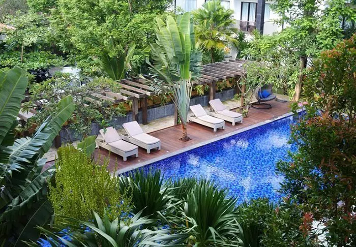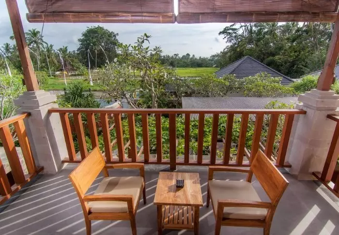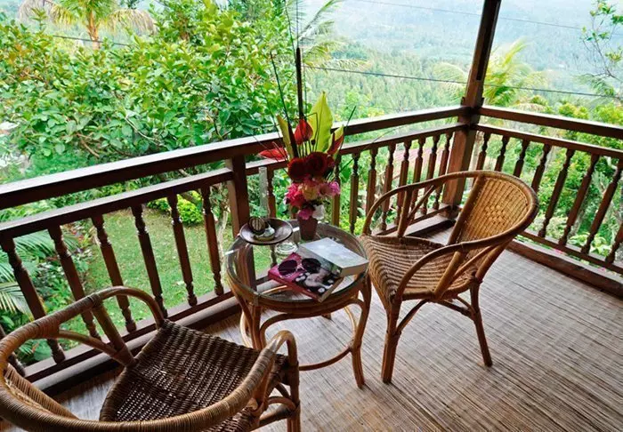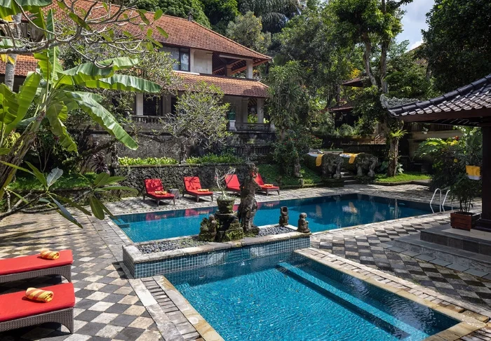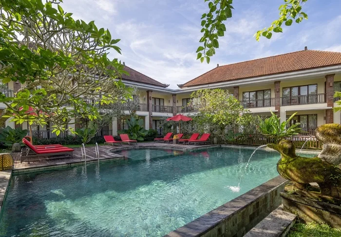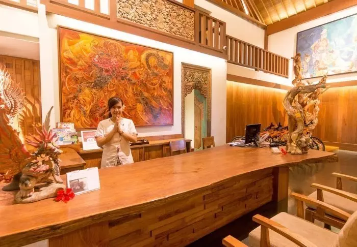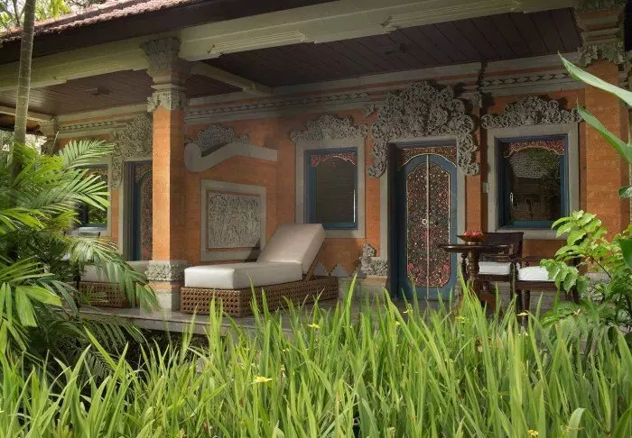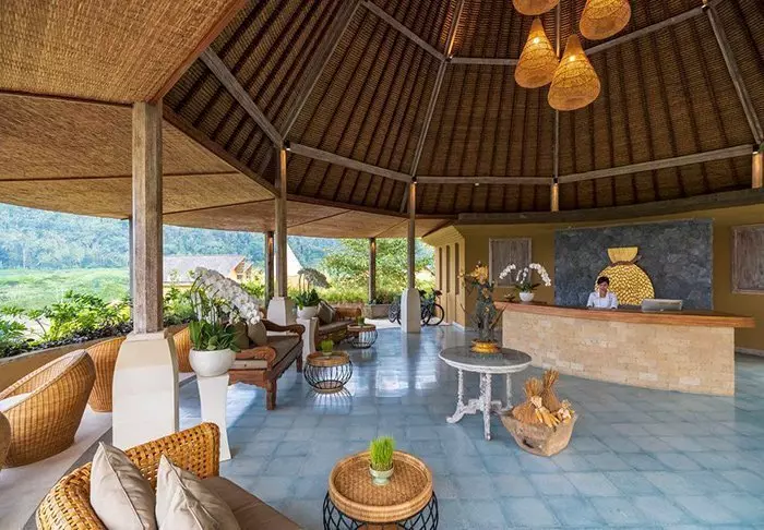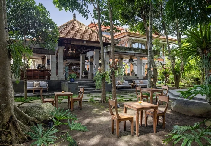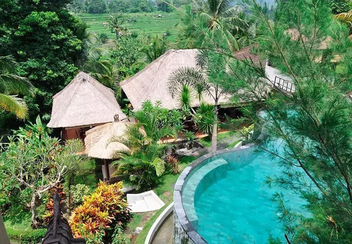 Det lille hotellet er bygget i tradisjonell balinesisk stil med naturlige materialer som ligger vakkert til i de grønne omgivelsene.