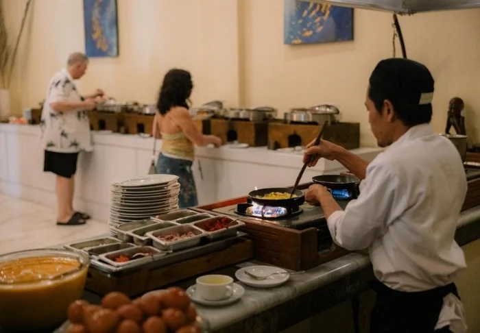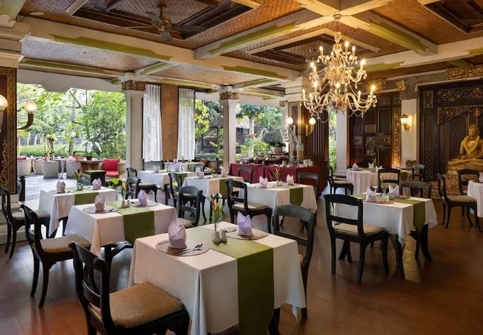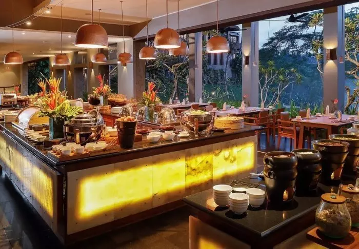 Når sulten melder seg, byr resortet på flere gode alternativer. Hovedrestauranten, Pandawa Restaurant, serverer en variert frokostbuffé med både internasjonale retter, nybakte fristelser og egge-stasjon. Til lunsj og middag tilbyr menyen alt fra friske salater til saftige sirloin-steaks og ferskfanget sjømat.