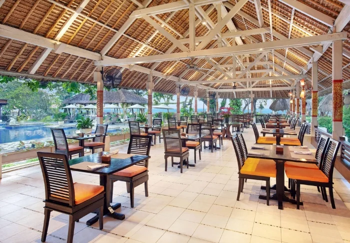 I løpet av dagen kan du unne deg enkle snacks og mellommåltider og kald drikke på Heliconia Restaurant, mens kvelden byr på kulinariske opplevelser på The Beach Restaurant. Her kan gjestene nyte balinesiske spesialiteter, fersk sjømat og internasjonal mat under åpen himmel med utsikt over havet. Rund av kvelden i Puri Bar, hvor du kan drikke et kaldt glass vin eller en fargerik drink til lyden av avslappende musikk mens du opplever den spektakulære solnedgangen før en ny dag begynner.