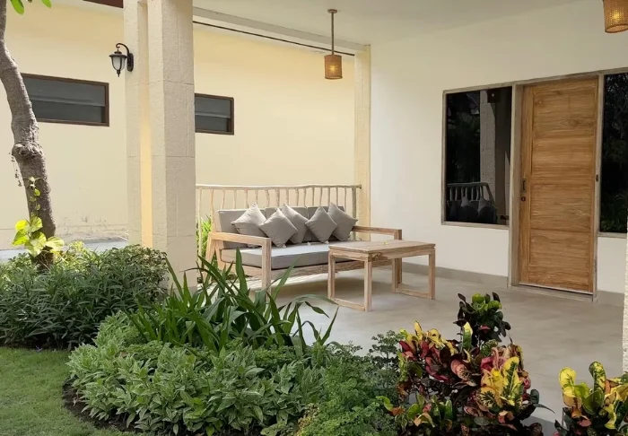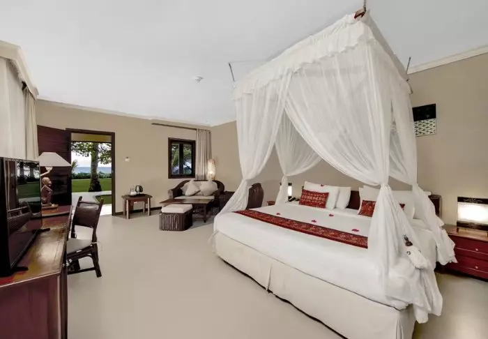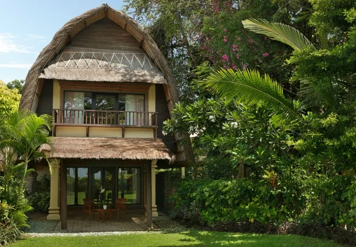 Du bor midt i hotellets frodige hage, mellom palmer og vakre tropiske blomster i en av de totalt 18 stråtekte bungalowene kalt «lumbung», som opprinnelig var en gammeldags rislåve. På bakkenivå har du et lite privat utendørsområde hvor du kan slappe av og sitte i skyggen. I andre etasje er det soverom med myggnett, aircondition, kjøleskap, gratis flaskevann, verdiboks, kaffe- og tefasiliteter og bad med hårføner. Det er også en liten balkong med bord og stoler.