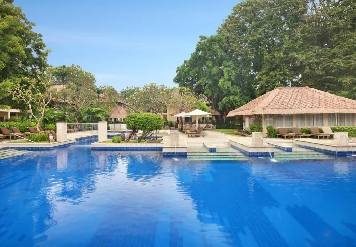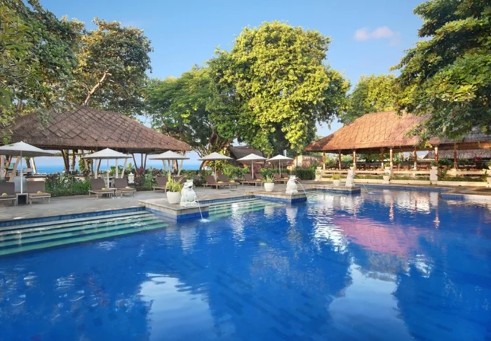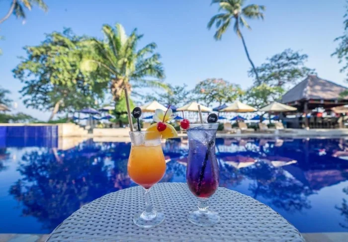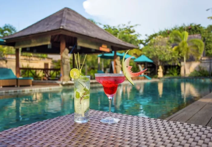 Resortet har to store bassengområder: Sahadewa Pool, som ligger i hagen og har et eget barnebasseng som gjør det perfekt for familier, og Nakula Pool, som er plassert rett ved stranden med fri utsikt over havet. Ved Nakula Pool finner du også den avslappede The Breeze Bar, hvor du kan nyte tropiske cocktails, ferske kokosnøtter, kald øl og lette snacks i skyggen av høye trær. Ved Sahadewa Pool ligger Sahadewa Bar, som serverer snacks, forfriskninger og cocktails gjennom dagen.