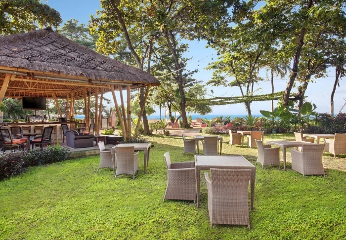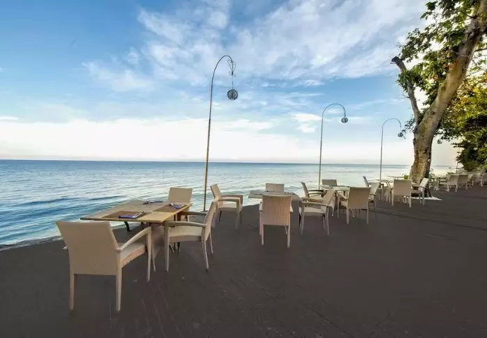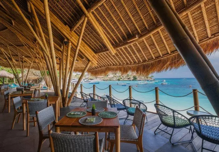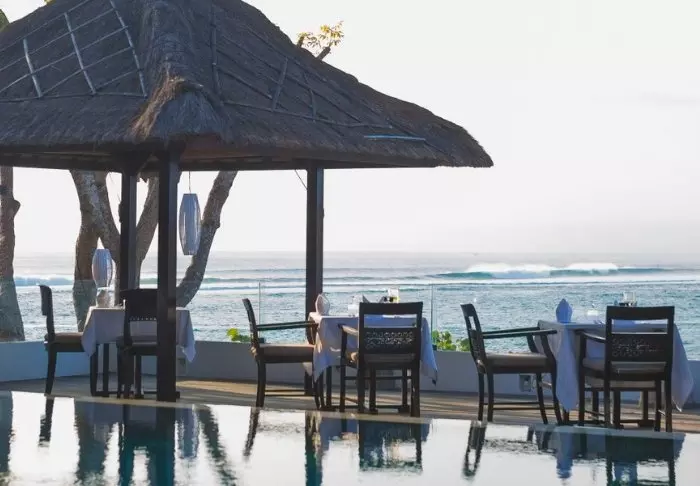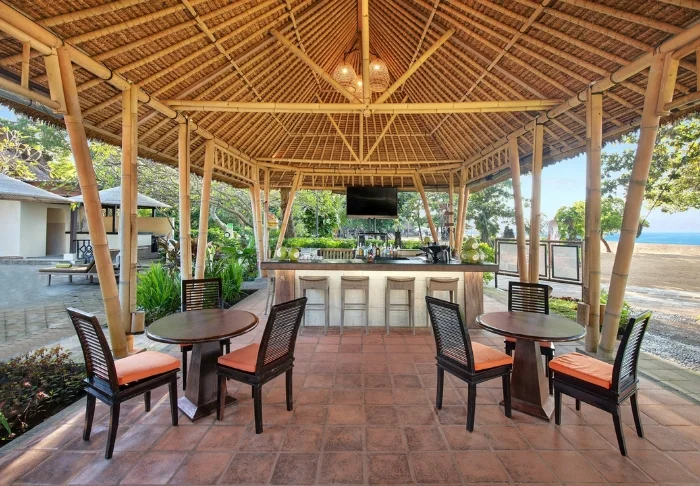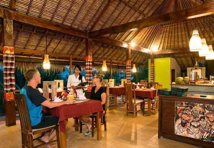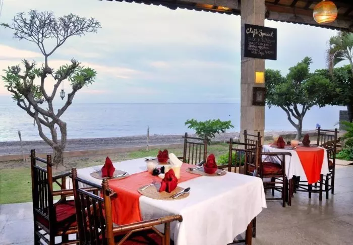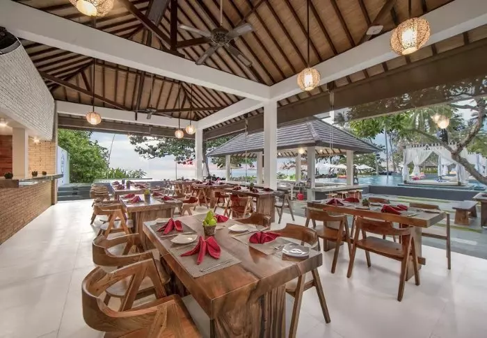 På restauranten står et team fra den lokale landsbyen klar til å servere balinesiske og indonesiske retter laget av lokale råvarer og fersk fisk som fanges av lokale fiskere. Her er det en deilig bris fra havet og vakker utsikt til stranden.