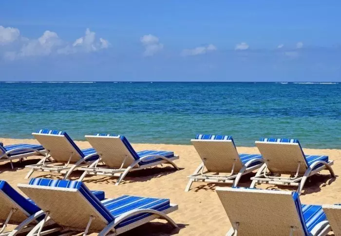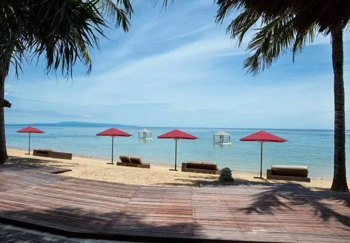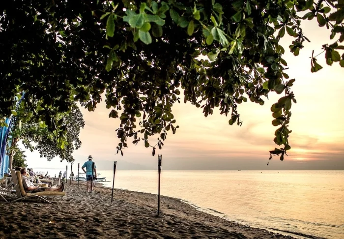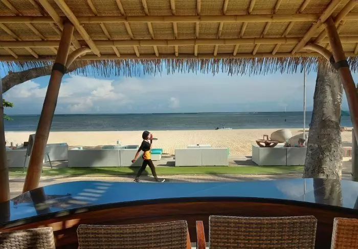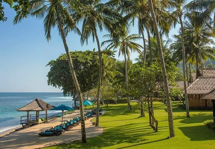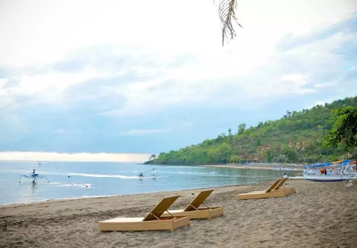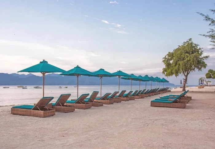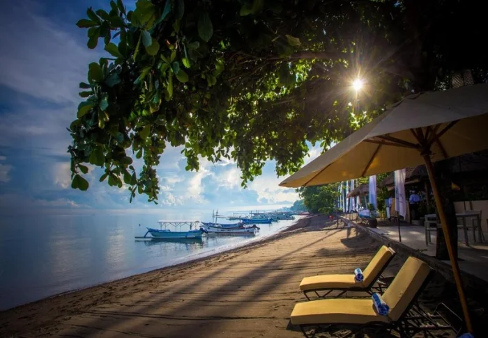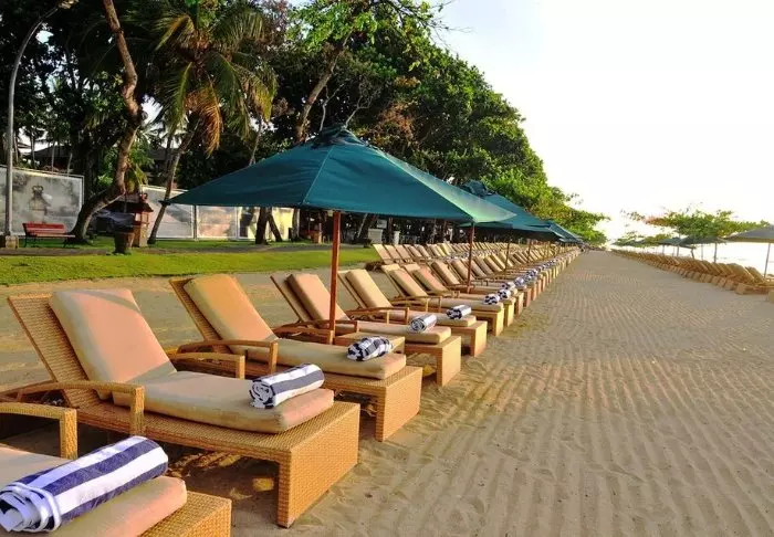 På stranden kan du fritt benytte både liggestoler og parasoller, og her kan du ligge og nyte livet og den indonesiske varmen.