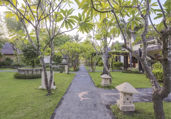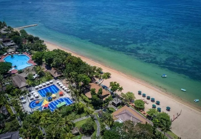 Mercure Bali Sanur Resort ligger rett ved en av Sanurs aller beste strender – en rolig, bred sandstrand med grunt vann og svalende palmeskygge. Resortet strekker seg over fem hektar med tropisk hage, der svaiende palmer og små stier snor seg mellom balinesiske bygninger med tradisjonelle alang alang-tak. Her bor du i fredelige omgivelser, samtidig som du har kort vei til Sanurs koselige gågate med kafeer, butikker og restauranter.