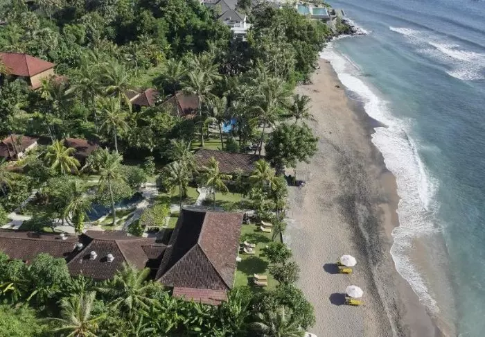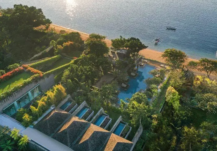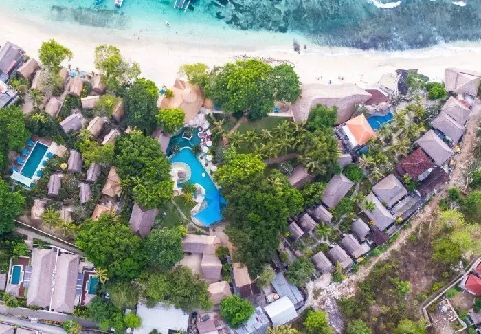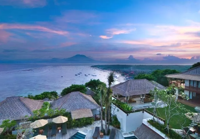 Batu Karang Lembongan Resort ligger i en korallskråning over Jungut Batu-stranden, med utsikt til Badung-stredet og den storslåtte vulkanen Mt. Agung på Bali.