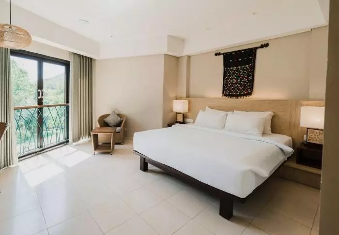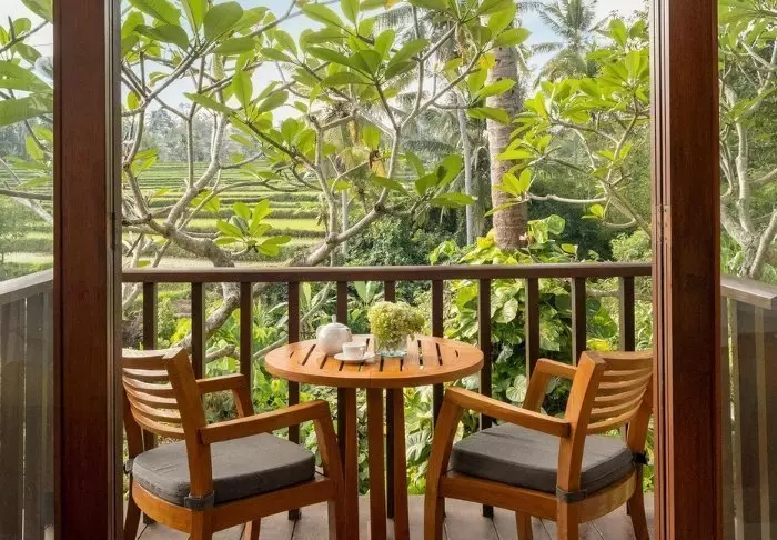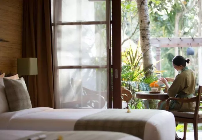 Rommene er store og vakkert innredet i lyse naturmaterialer, og alle rom har en privat balkong som vender ut mot fjellene, rismarkene og elven. Alle rom har Wi-Fi, aircondition, minibar, safe, te- og kaffefasiliteter samt myggnett over sengen. Badet har badekar, og her finner du også badekåpe, tøfler, toalettartikler og hårtørker. For å gjøre oppholdet ekstra behagelig får gjestene daglig 2 gratis flasker vann og friske tropiske frukter.