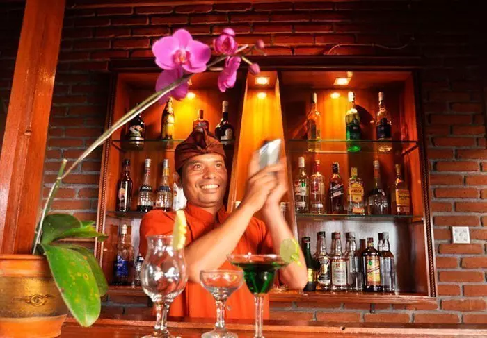 Etter en herlig dag kan du avslutte kvelden med en forfriskende drink i baren mens solen sakte går ned over Lombok-stredet.