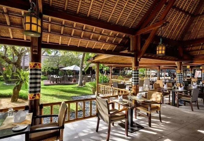 Når sulten melder seg, kan du på Restaurant Kopi Bali spise både lokale, vestlige og vegetariske retter, mens hotellets bar byr på kalde drikkevarer du med fordel kan nyte sammen med solnedgangens vakre farger.