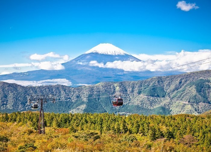 Du tar deretter kabelbanen fra Owakudani Station og ned til Togendai Station. Dette er den lengste kabelbanen i Japan, og det er glassvinduer på alle fire sider av gondolen, så alt er lagt til rette for å nyte naturens skjønnhet.