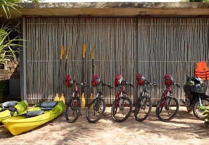 Resortet ligger ca. 2,5 km fra elveleiet hvor båten fra Kratie legger til. Avhengig av vannstanden i Mekongfloden går du i tørkeperioden maks. 900 meter over den brede stranden og opp til sykkelstien, der en tuk-tuk kjører deg frem og tilbake fra hotellet. I regntiden, når vannstanden er høy, forsvinner stranden nesten helt, og du slipper å gå over den brede stranden siden båten kan legge til nesten helt oppe ved sykkelstien. Bagasjen din blir fraktet fra elveleiet og helt frem til hotellet.