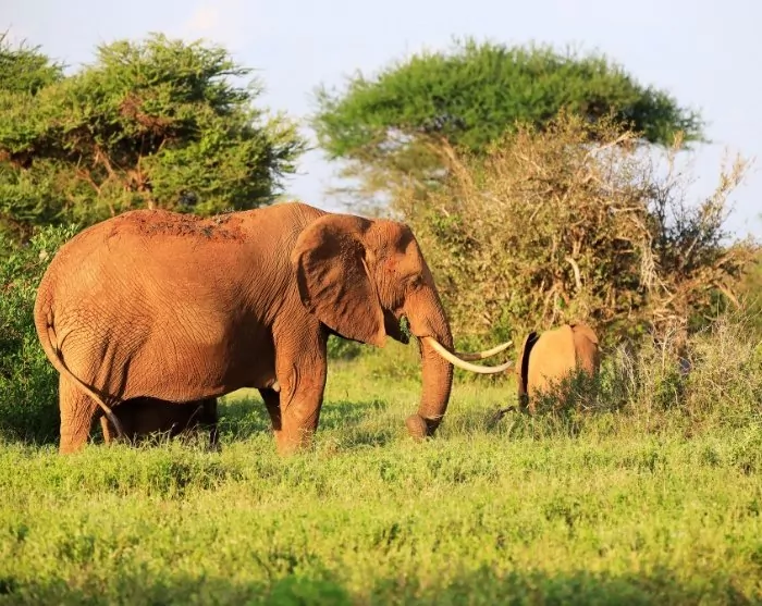 I Tsavo East er jorden skarpt rød, noe som gir dyrene et karakteristisk rødlig utseende. Du kan like godt bli vant til den røde jorden – du møter den igjen når du kommer til Madagaskar.