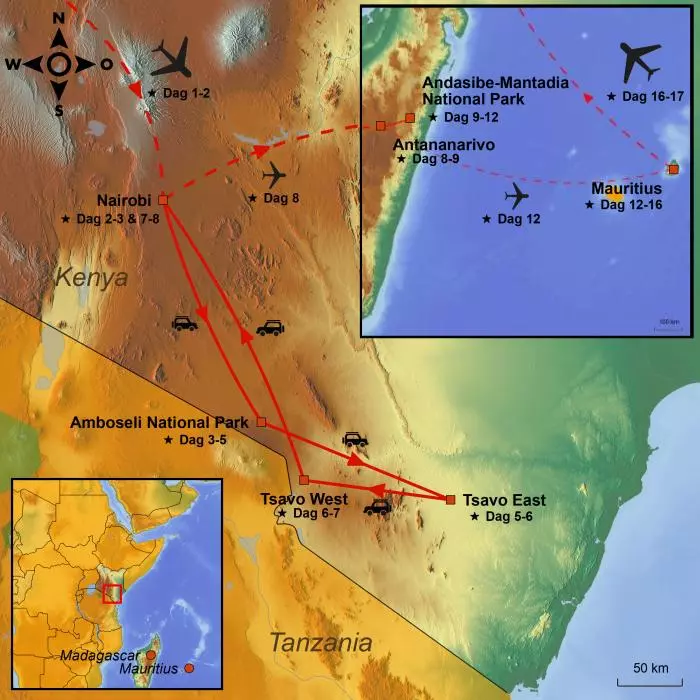 I Kenya får du oppleve neshorn, elefanter og løver. På Madagaskar får du vandre gjennom regnskogen på jakt etter lemurer og kameleoner, før du avslutter reisen med en badeferie på eksotiske Mauritius.