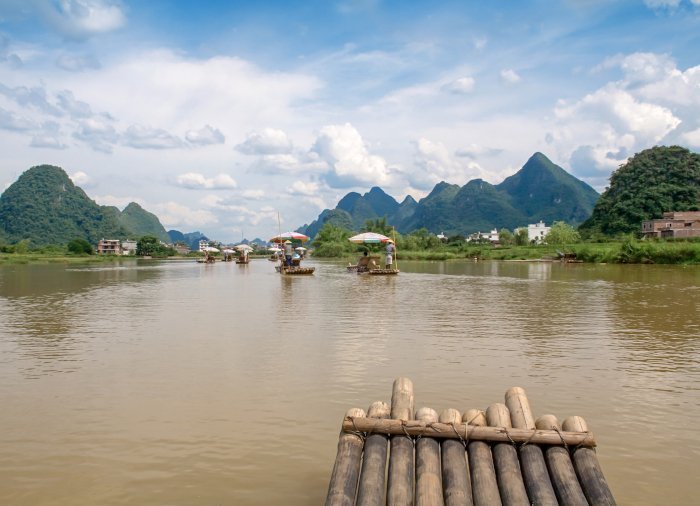 Bli med på en stille og rolig raftingtur på Yulong-floden, som er lengste biflod til Li-floden, som renner fra Guilin til Yangshuo.
