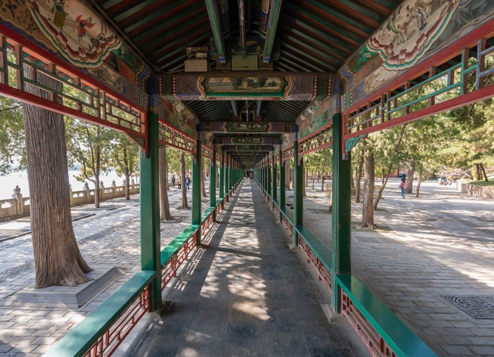 Omvisningen starter ved den østlige inngangen, der du ser palassene. Heretter venter en spasertur i ”Den lange korridor”, som keiser Qianlong bygget til sin mor så hun kunne glede seg over utsikten til Kunming-sjøen også når det regnet eller var kaldt. Korridoren er 728 meter lang og utsmykket med 14.000 fargerike malerier. Fra den ene enden til den andre går du gjennom fire åttekantede paviljonger som representerer de fire årstidene.