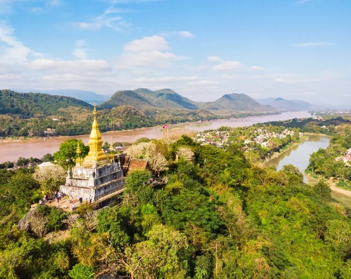 Turen fortsetter til Phousi-fjellet, kun én kilometer unna. Her venter 328 trappetrinn som leder deg helt til toppen. Underveis passerer du små templer og Buddhastatuer, hvor du kan ta en pause og nyte utsikten. På toppen blir du belønnet med et malerisk panorama over Luang Prabang, elvene, templene og det frodige landskapet – alt rammet inn av grønne fjell.