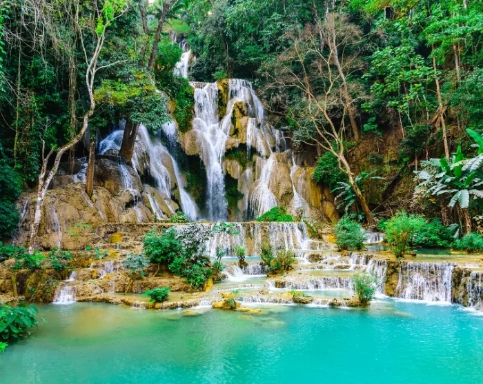 Etter en deilig lunsj går turen 30 km sørover til Kuang Si-fossen. Omgitt av frodig, tropisk jungel strømmer vannet i kaskader over tre nivåer nedover en bratt skråning. Det høyeste fallet er 60 meter, og på det nederste nivået kan du bade i det turkisblå, rolige vannet.
