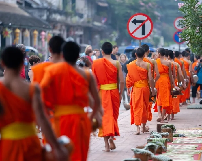 Hver morgen i de tidlige morgentimene utspiller det seg en helt spesiell seremoni i Luang Prabang. Flere hundre munker beveger seg stille gjennom gatene for å samle inn almisser. Hver familie sender en representant ut på gaten med mat eller drikke som fordeles i munkenes boller. Det er vanskelig å ikke la seg gripe av den respektfulle stillheten og verdigheten som preger dette daglige ritualet.