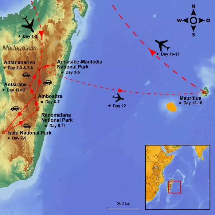 I Kenya får du oppleve neshorn, elefanter og løver. På Madagaskar får du vandre gjennom regnskogen på jakt etter lemurer og kameleoner, før du avslutter reisen med en badeferie på eksotiske Mauritius.