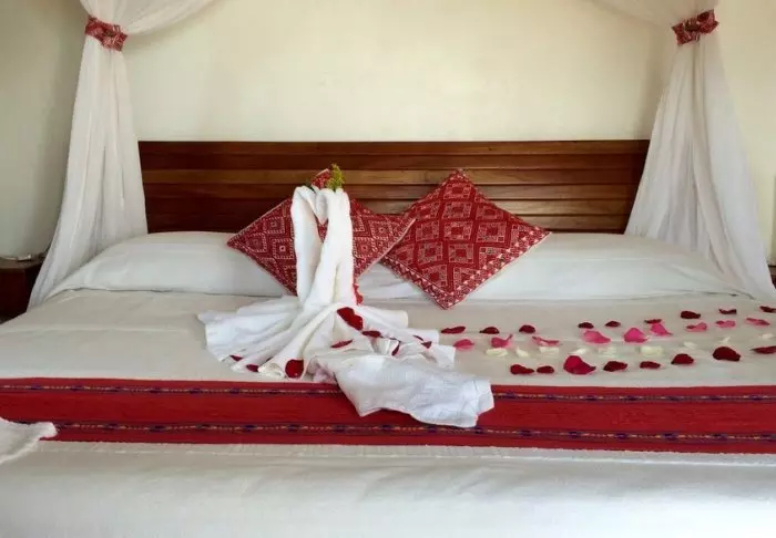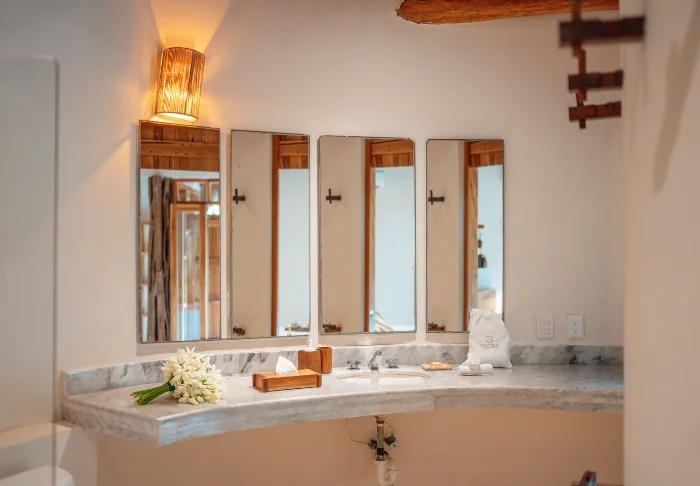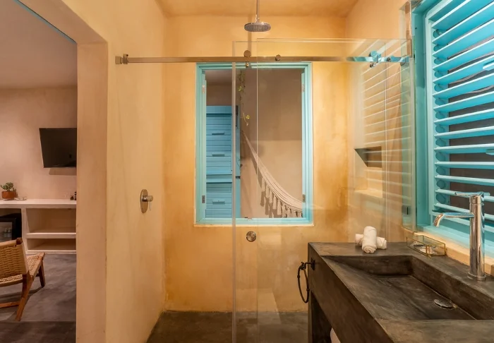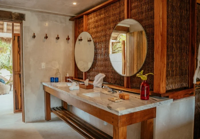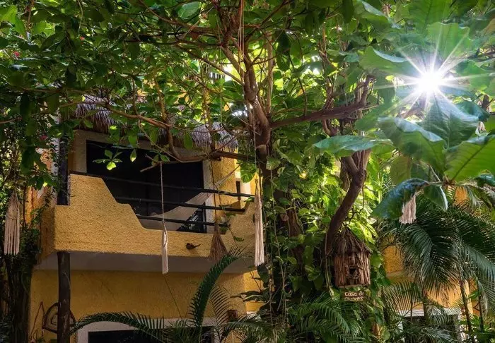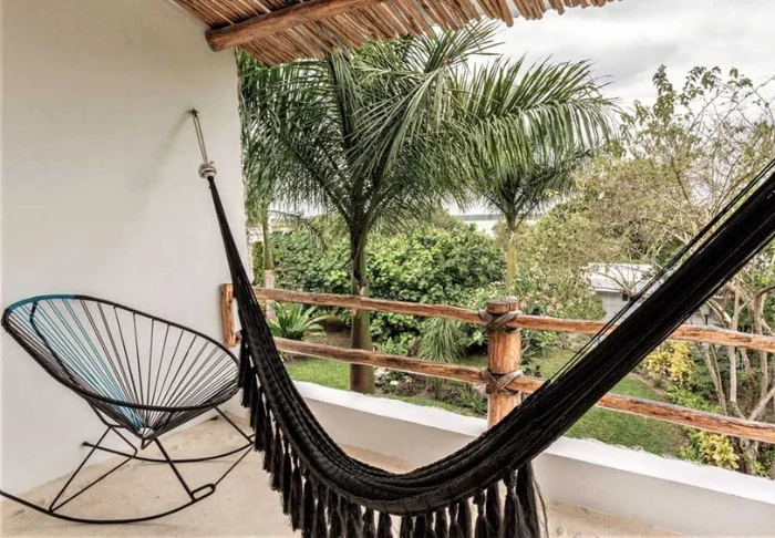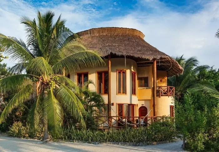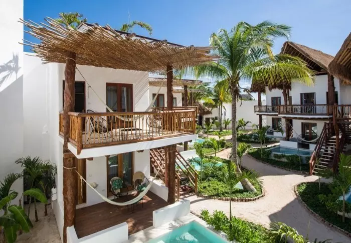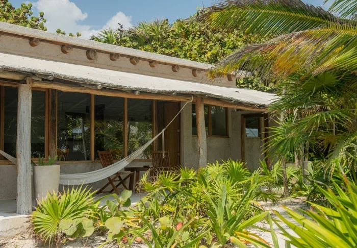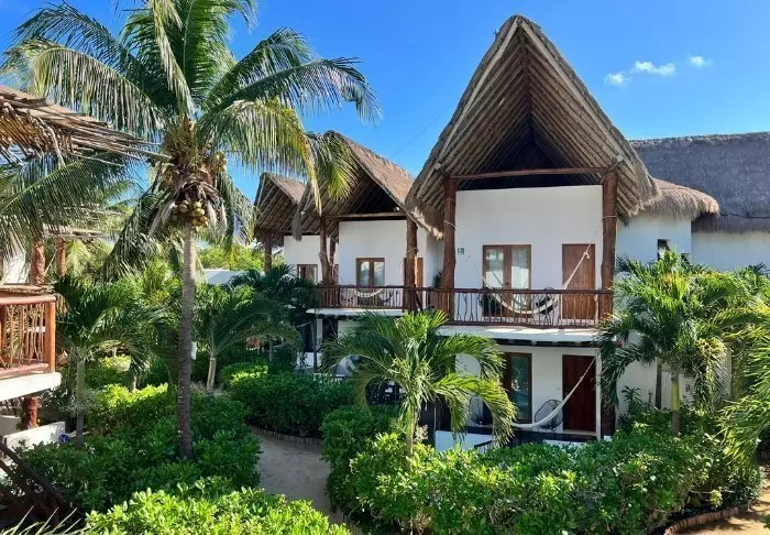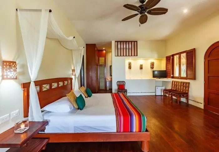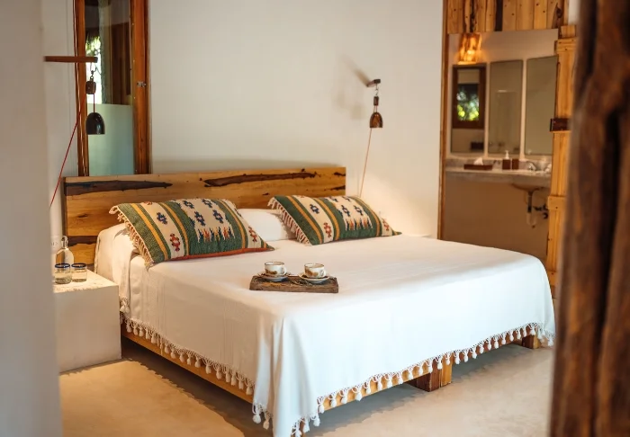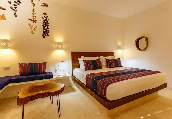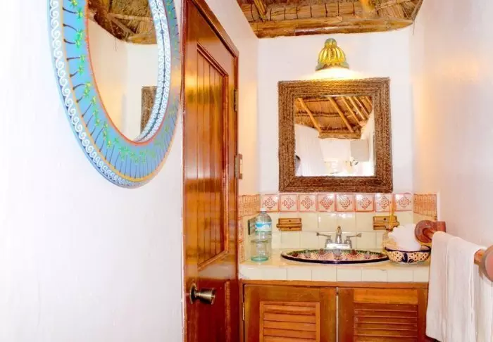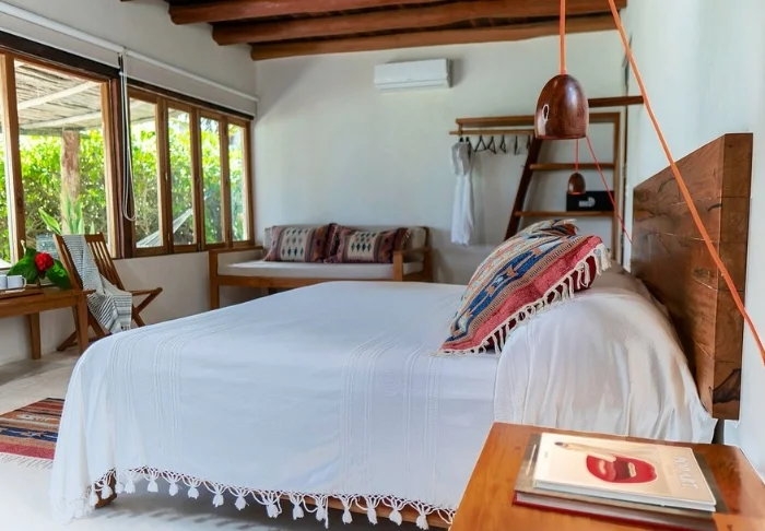 Du bor i sjarmerende hytter som er bygd av naturlige materialer, inkludert med et tak laget av tørkede palmeblader. Rommene er romslige og elegant innredet med en harmonisk blanding av lyse farger, fargerike meksikanske tepper og puter, samt vakre mørke tregulv og møbler.