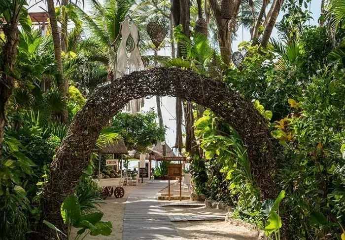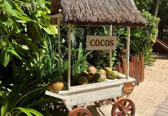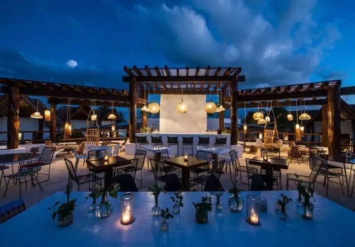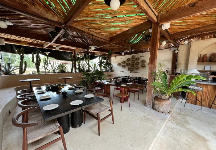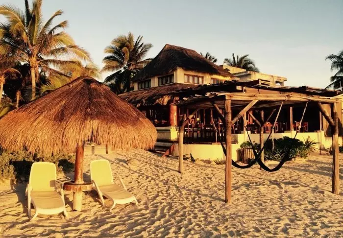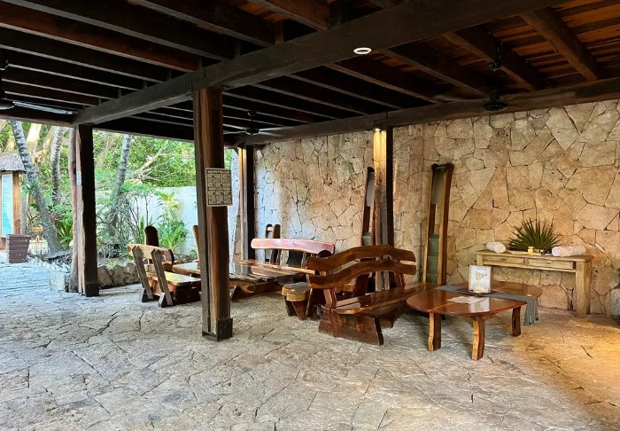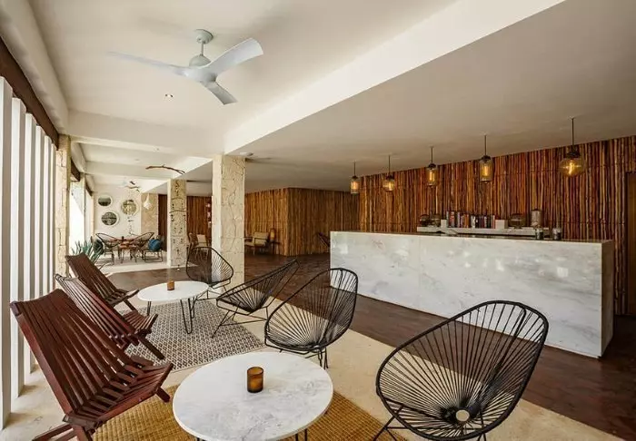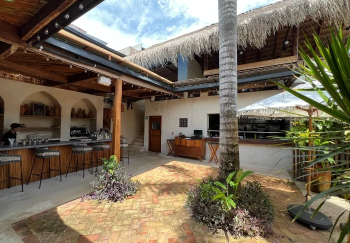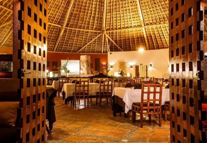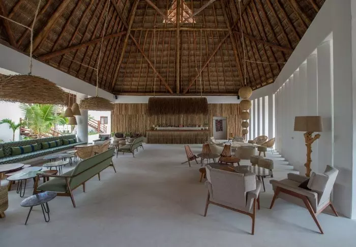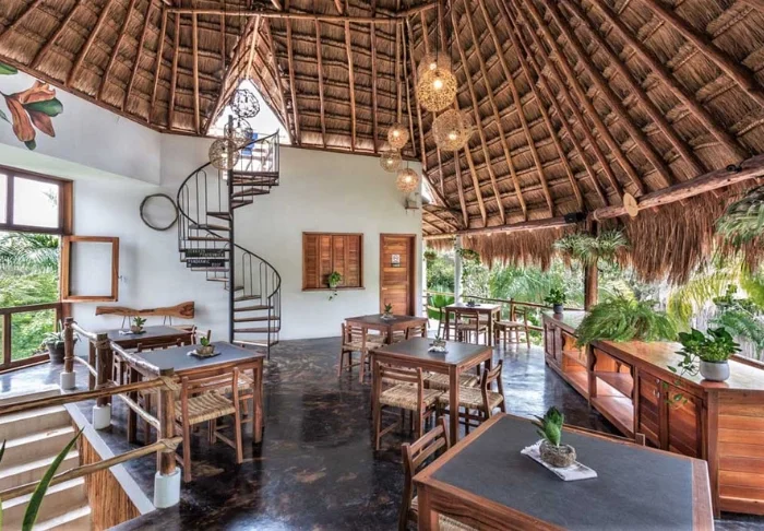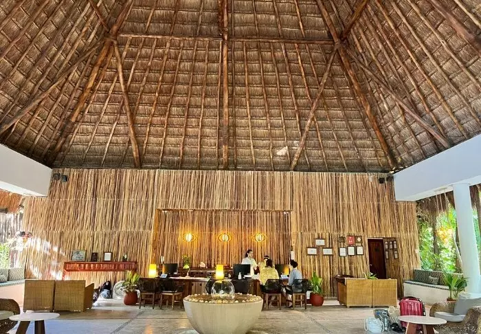 Både hotellets resepsjon og restaurant er bygget under en høy, stråtekket palapa, som er en tradisjonell meksikansk byggestil der naturlige materialer som tre, bambus og tørkede palmeblader brukes. I tillegg til å være veldig vakker, gir de åpne sidene og det luftige taket god ventilasjon, noe som gjør dem ideelle i varme og fuktige klima.