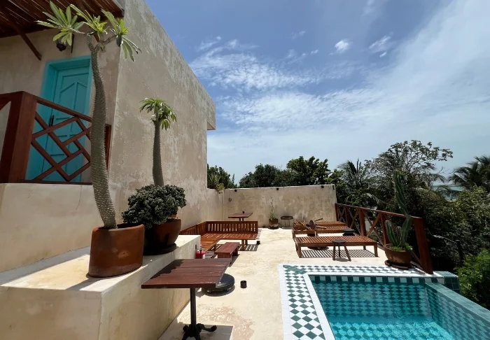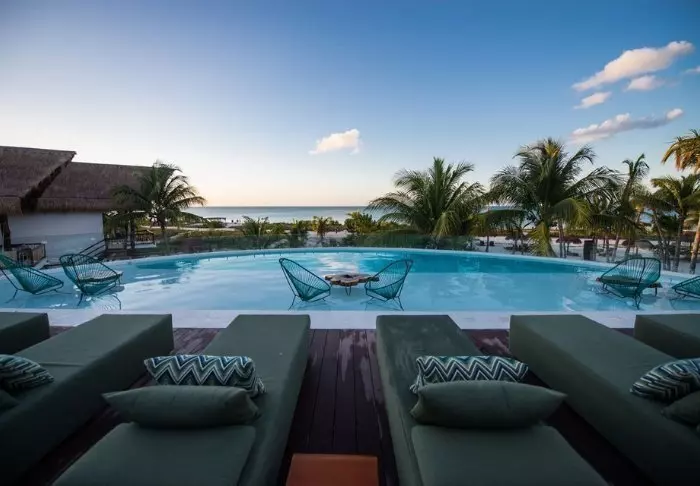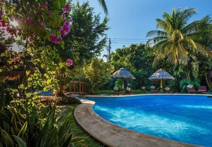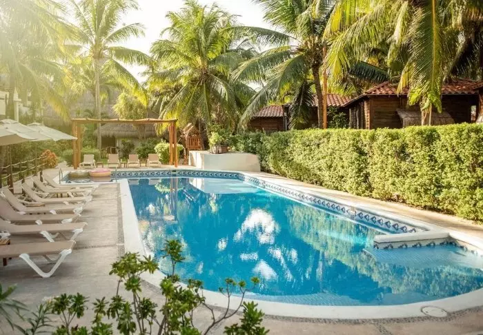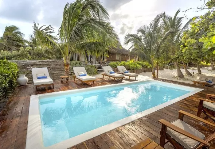 I forlengelsen av hovedrestauranten ligger svømmebassenget og den tilstøtende bassengbaren, der du kan svømme for å få noe kaldt å drikke uten å måtte gå ut av bassenget først. Det er både solsenger rundt bassenget og i hotellets hage, der du kan lese en god bok i skyggen av et palmetre. Hvis du krysser den lille sandveien, havner du på Holbox’ berømte strand med asurblått vann og en varm havbris. Her er det også solsenger for gratis bruk, og du kan selvfølgelig bestille mat og drikke som skal leveres her, for å skjemme deg bort litt ekstra.