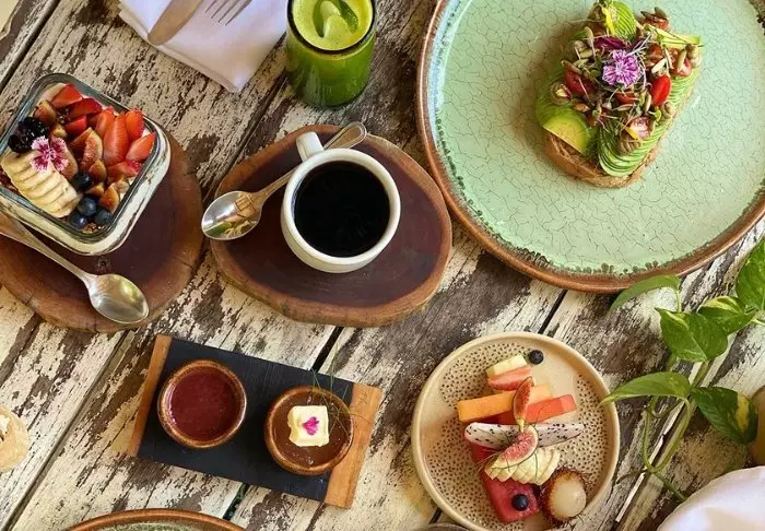 Hotellet har to restauranter: en hovedrestaurant, som er åpen hele dagen, og en sushirestaurant, som bare er åpen om kvelden. I hovedrestauranten serveres frokosten som en overdådig buffé med et stort utvalg av frukt, brød, bakverk, egg og deilig ferskpresset juice. Å nyte frokosten under åpen himmel i tropiske omgivelser til lyden av bølgene som forsiktig bryter mot kysten, er helt enkelt magisk.