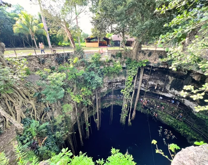 Etter besøket ved Chichén Itzá og en liten lunsjstopp, fortsetter turen til den vakre cenoten San Lorenzo Oxman, hvor du kan glede deg til en forfriskende dukkert. En cenote er et naturlig, underjordisk ferskvannshull, og det er noe helt spesielt for Yucatán. Oxman-cenoten er åpen, så sollyset treffer det friske vannet og fremhever den grønne fargen. Frodig vegetasjon og trerøtter vokser ned langs sidene av cenoten og gir den et helt eventyrlig preg. Det er toaletter og skifterom her, og du kan leie et skap til eiendelene dine og en redningsvest mot et lite gebyr.