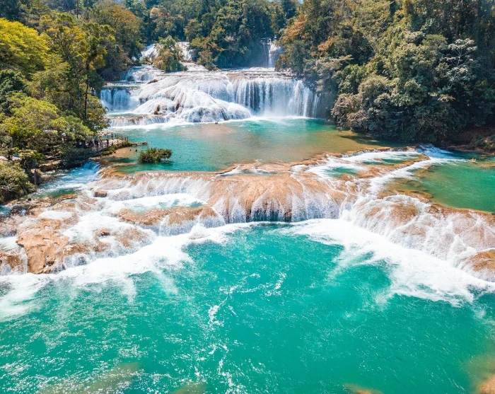 Første stopp er ved Agua Azul-fossefallene (de blå fossefallene), som er en serie av brusende fossefall, der turkisblått vann strømmer nedover hvite kalkstenshyller i flere nivåer. Vannets karakteristiske farge skyldes det høye innholdet av mineraler og kalk, som reflekterer sollyset og skaper en nesten eventyrlig kulisse. Fossefallene er omgitt av regnskog, og langs elvens løp dannes små naturlige bassenger, der du kan bade og nyte det friske vannet.