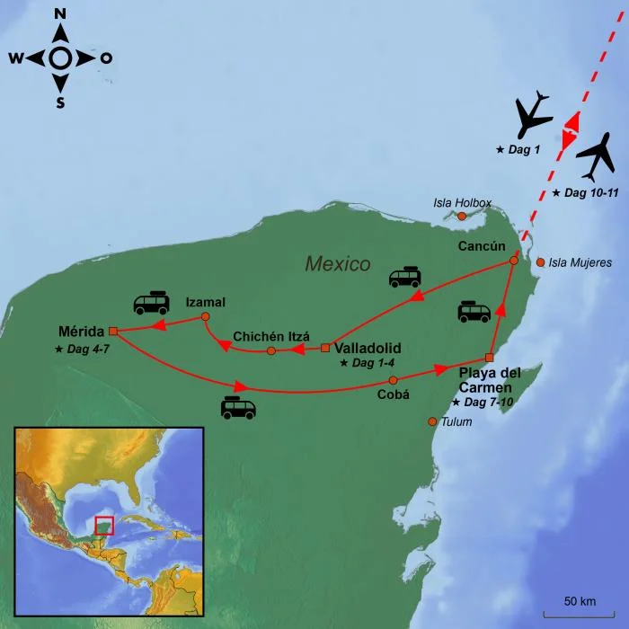 Underveis på denne reisen kan du glede deg til å utforske den verdenskjente mayaruinen Chichén Itzá, den ikoniske gule byen Izamal, og de mystiske mayaruinene i Cobá som ligger dypt inne i jungelen. Vi har selvfølgelig også inkludert et besøk ved en av områdets vakre cenoter, hvor du kan ta et forfriskende bad i det krystallklare vannet. Det blir også god tid til å rusle rundt i sjarmerende, fargerike gater og å nyte Mexicos imponerende strender, hvor det turkise havet og svaiende palmer gir den perfekte rammen for avslapning.