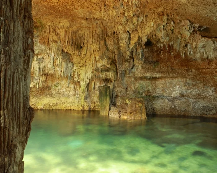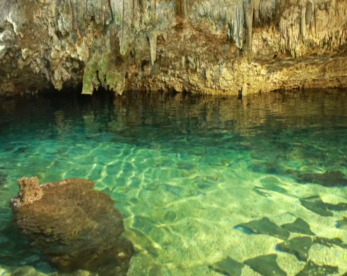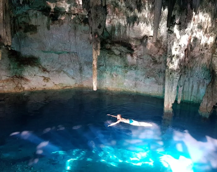 Etter besøket ved ruinene og en kort lunsjpause (lunsj er inkludert), går turen videre til den nærliggende cenoten Choo-Ha – en stemningsfull, underjordisk ferskvannshule med krystallklart vann og vakre dryppsteinsformasjoner. Her får du tid til et forfriskende bad i fredelige omgivelser. Ved cenoten finnes det omkledningsrom med dusj, toaletter, og det er også mulig å leie redningsvest.