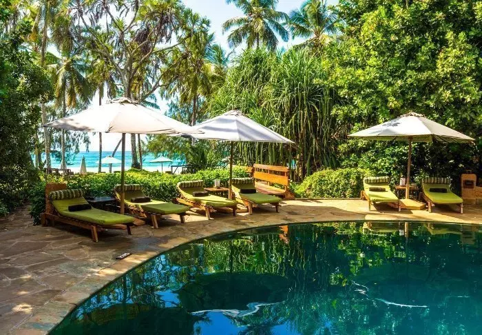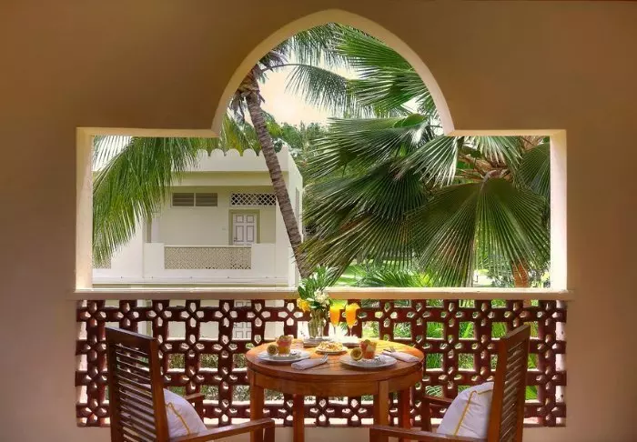 Resortet er omgitt av 80 hektar med tropiske hager og plassert på en forhøyning med flott utsikt over det indiske hav og den fine, gyldne stranda.