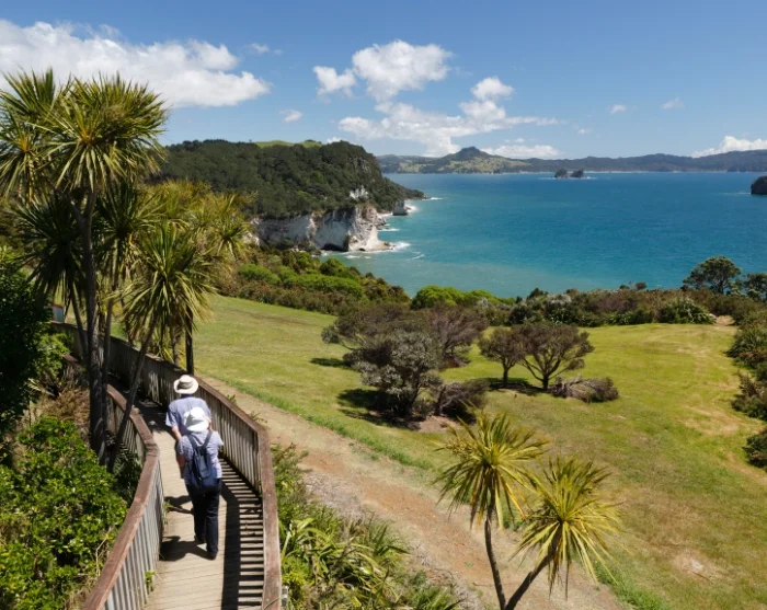 Vandringen dit tar 30-45 minutter via små, ujevne stier, så det krever en rimelig god fysisk form. Til gjengjeld blir du belønnet med en spektakulær utsikt over klippeformasjonen Cathedral Cove og stranden med samme navn, som faktisk ble kåret som en av verdens 50 vakreste strender av World’s 50 Best Beaches i 2025. Cathedral Cove er en del av Te Whanganui-A-Hei Marine Reserve og har stor kulturell betydning for maorifolket, som kjenner stedet under det tradisjonelle navnet Mautohe.